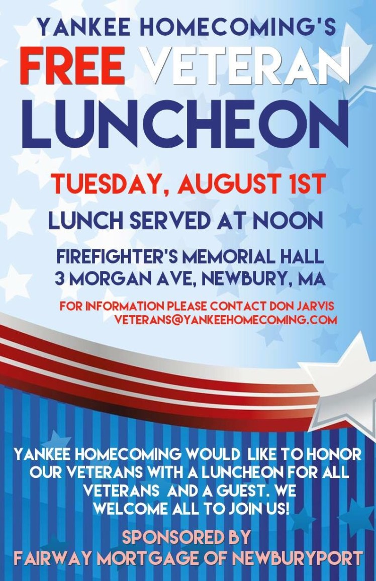 For the last couple of years Yankee Homecoming has hosted an annual Free Veteran Luncheon. This year the veteran luncheon is being held at the Firefighters Memorial Hall in Newbury. In the years past this event was held at the Elks Club in Newburyport. As a resident of Newbury and a veteran that is extremely active I’ve been working tirelessly the last couple of years to increase veteran related activities in town – relocating this luncheon is a step in that direction.